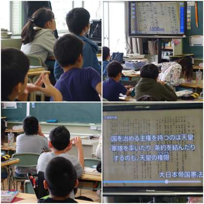 6年生は「明治時代」の学習を進めています。今日は「大日本帝国憲法」についての理解を深めていました。最後の公民分野で「異本国憲法」について学習するので、比較しながら日本初の憲法について考えて見るのもおもしろいかもしれません。