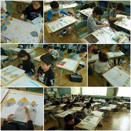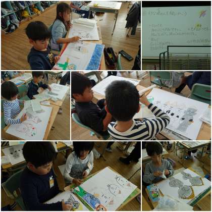 下絵をしっかり描き、クレパス・絵の具を使って仕上げていきます。