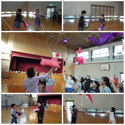 ふろしきを使ってリズムよく上に投げたり拾ったり、