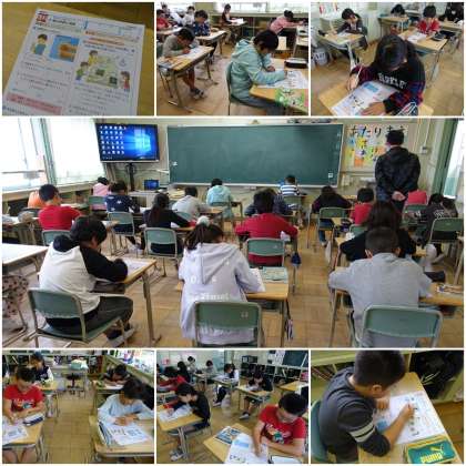 4年生は空気や水や金属をあたためたり冷やしたりして、それぞれの性質について調べてきました。今日は学習してきた内容のテストを行いました。