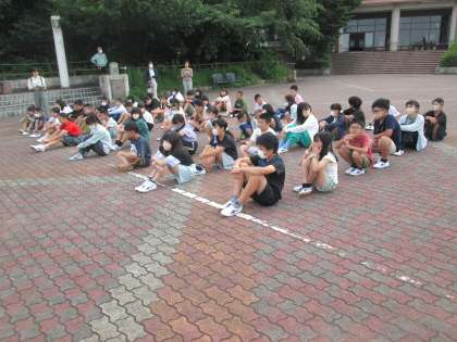 朝のつどいでは、国旗掲揚とラジオ体操、宿泊者の話がありました。同宿だった鉄道関係の仕事をしている方の話を聞き、三ツ渕小学校5年生のテーマを聞いてもらい、笑顔あふれる朝を迎えました。