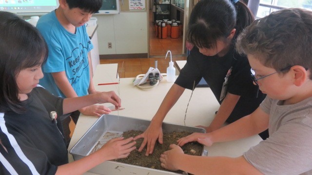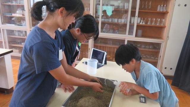 理科は、川の流れを再現するために、砂山で上流・中流・下流を作り、そこに水を流して、砂の変化の様子を観察しました。