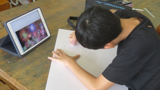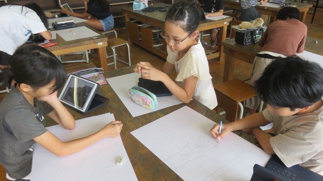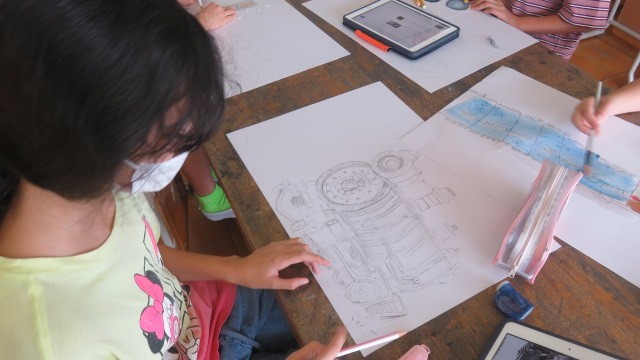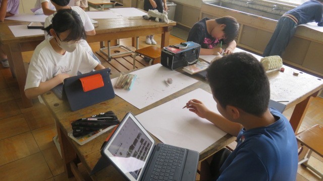 図工は、競技会で取り組むお話の絵、『銀河鉄道の夜』の下絵を描きました。イラストを参考に、自分が思い描く情景を絵にしていきます。
