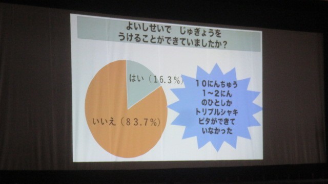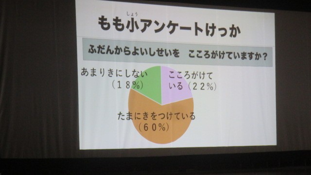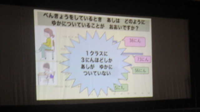 保健委員会が実施した、児童へのアンケート調査の結果から、10人中8人が良い姿勢を意識しているが、実際に足が床についた状態で授業を受けている人は1クラスに3人ほどしかいないという事実が分かりました。