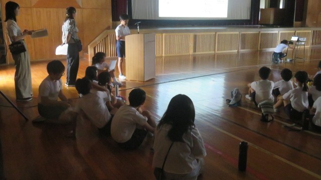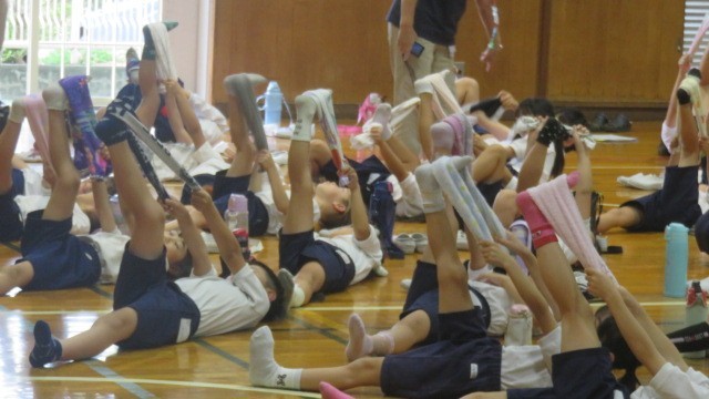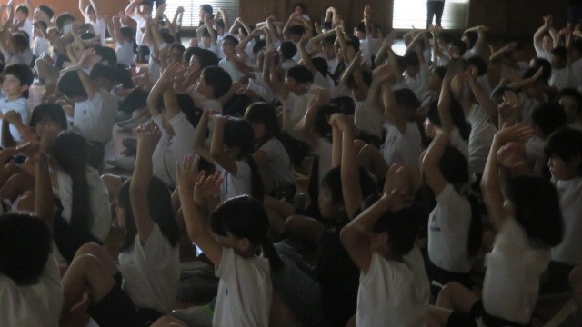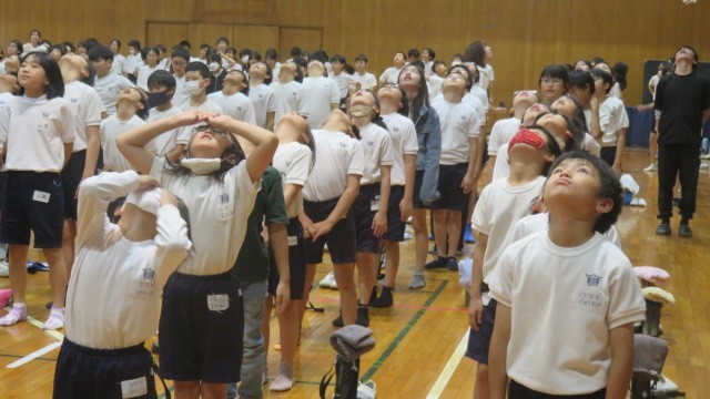 保健委員会の発表の後には、背骨コンディショニングインストラクターの加藤先生から、背骨をまっすぐにするストレッチ体操も教えいただきました。放課や家で、こまめにストレッチができるといいですね。