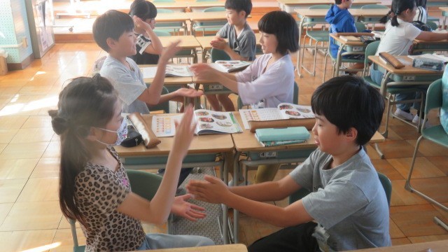 音楽は、日本と外国の手遊び歌を聞き比べ、ペアで手合わせを楽しみました。