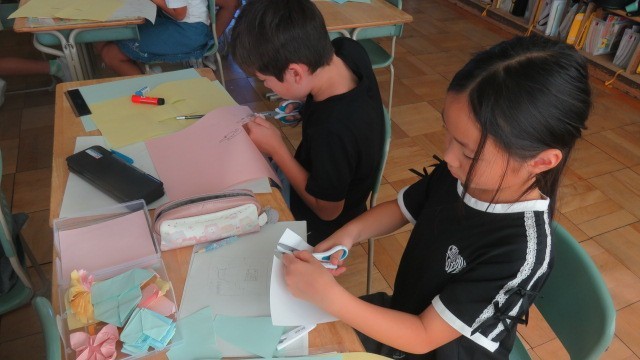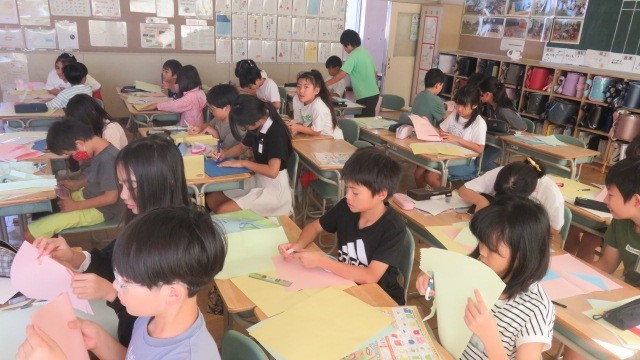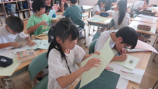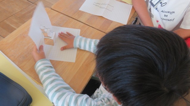 図工は、飛び出すカードの飛び出す仕組みを工夫しました。「飛び出すところを3段にしたい」「〇〇が飛び出すようにするには、飛び出す仕組みを何cmくらいにするといいのかな?」試行錯誤です。