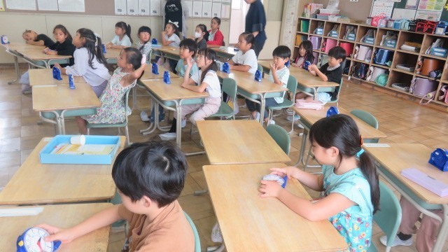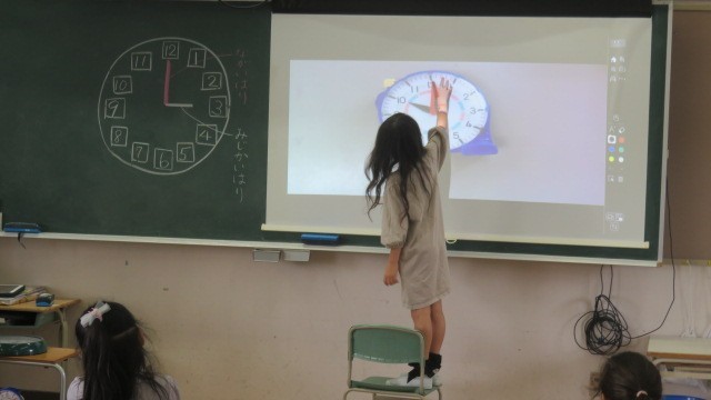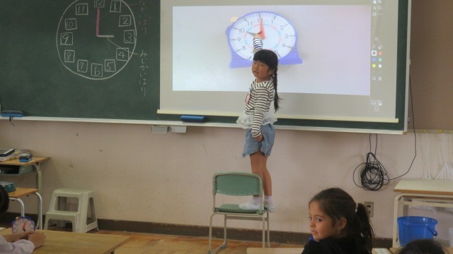 算数は、時計の長針・短針のさす目盛りに着目して、何時・何時半を読む学習をしました。