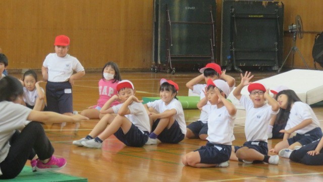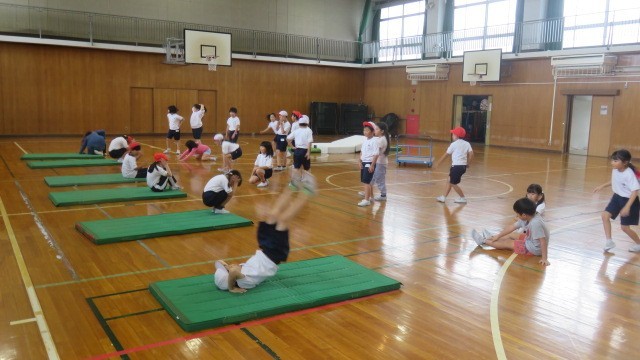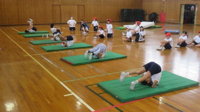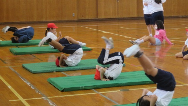 マットで後ろ回りの練習をしました。両方の手のひらをしっかりマットにつくことを意識して練習しました。
