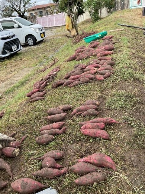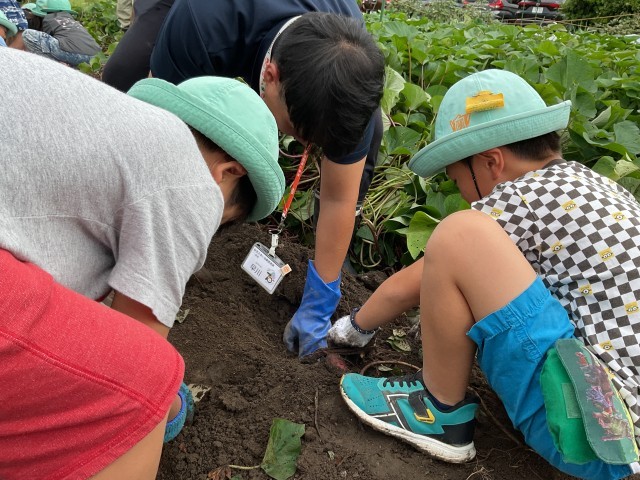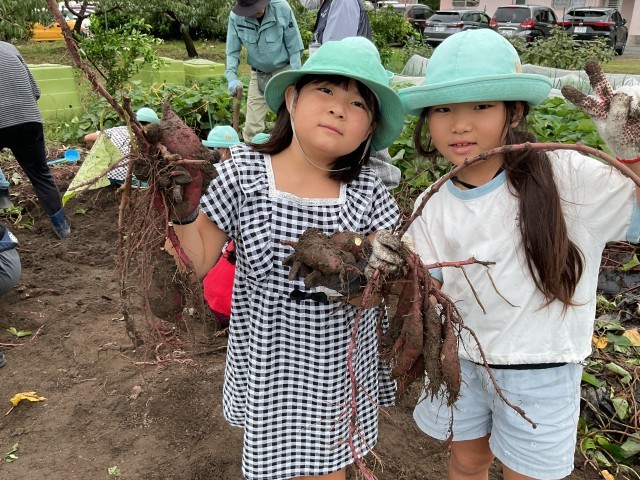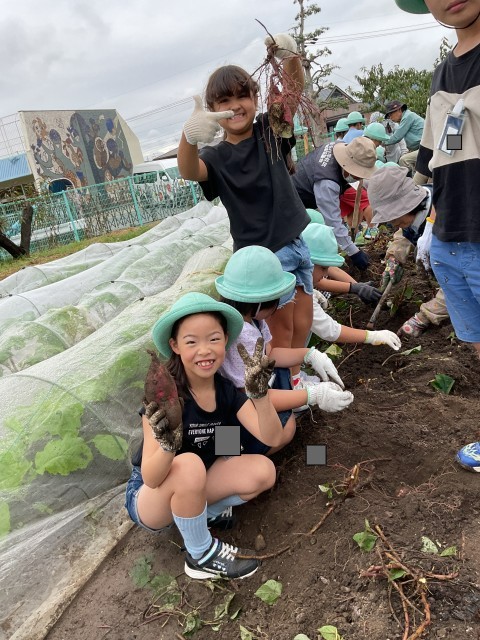 地域の方が作ってくださったさつまいもを掘らせていただきました。最初は「虫がいっぱい!!」とおびえていましたが、土を掘ってさつまいもを収穫するうちに楽しくなり、最後は「楽しかった!」と言って終わりました。さつまいもを全員数本ずつ、持たせていただきました。お家で調理していただき、食卓に出していただければ幸いです。