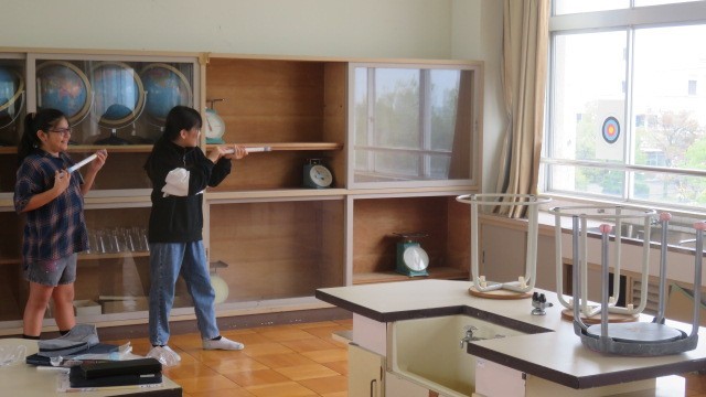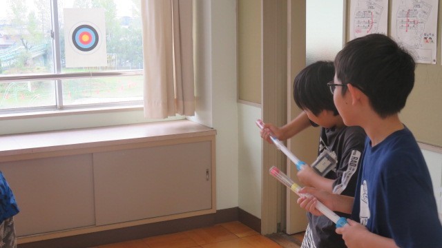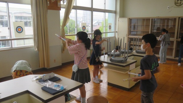 理科は、物の性質を調べる学習で、閉じ込められた空気は、押されるとどうなるのかを調べていきます。導入では、空気でっぽうを使った的当てをしました。