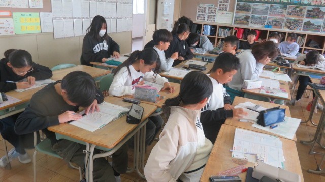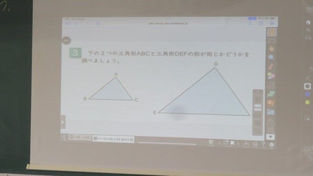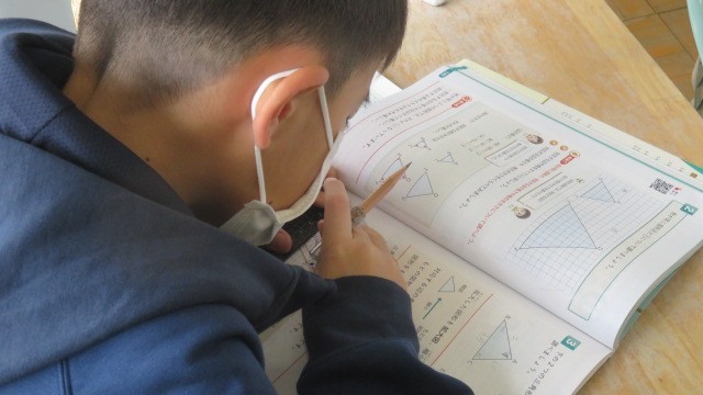 算数は、頂点、辺、角の対応をみつけて、拡大図・縮小図の作図に挑戦しました。