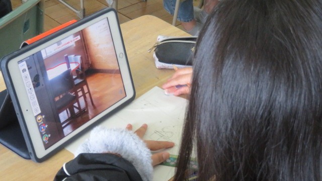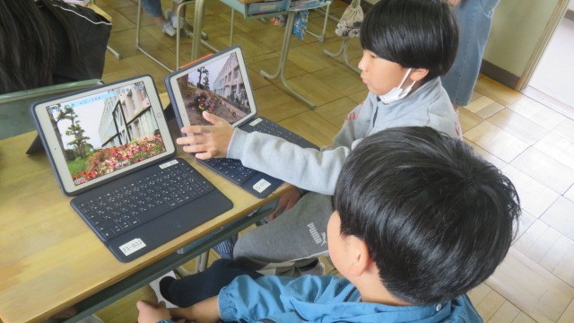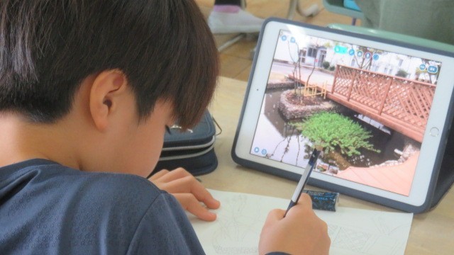 図工は、学校のお気に入りの場所を描きます。今日は、お気に入りの場所の写真を撮り、下描きまで進めました。構図も重要なポイントです。角度を変えて撮影をしました。