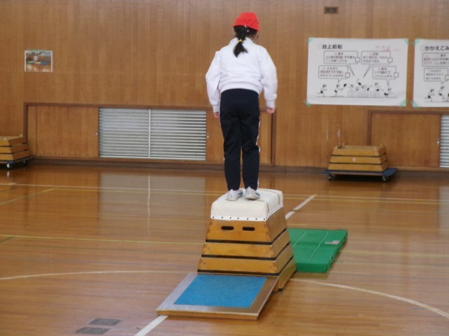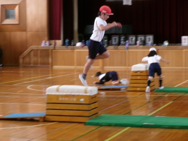体育館で跳び箱につながる運動をしました。わに歩きやケンケンをして、手や足をめいいっぱい動かしました。初めてのペア馬跳びでは、相手の子に合わせて高さを変えながら楽しく取り組んでいました。跳び箱へのジャンプ活動を通して、跳び箱の高さにも慣れてきたようです。