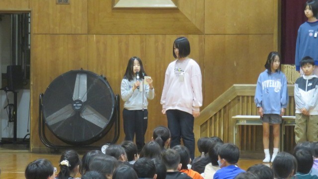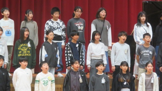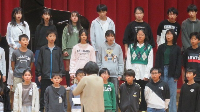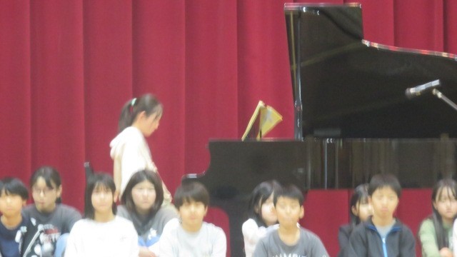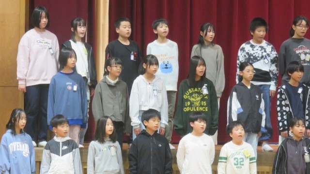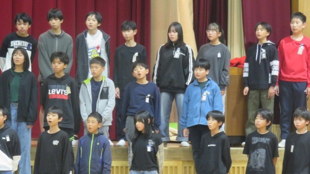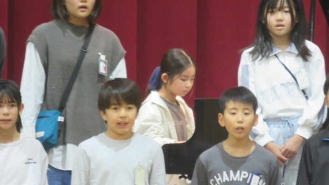 昨日行われた小牧市小中学校音楽会で披露した合唱曲2曲を、全校児童の前で歌いました。