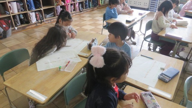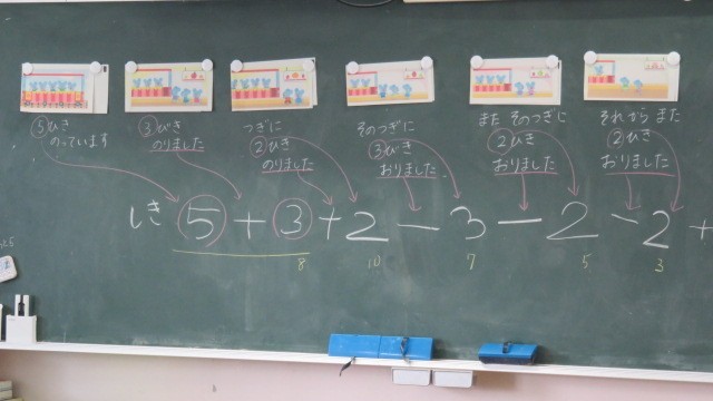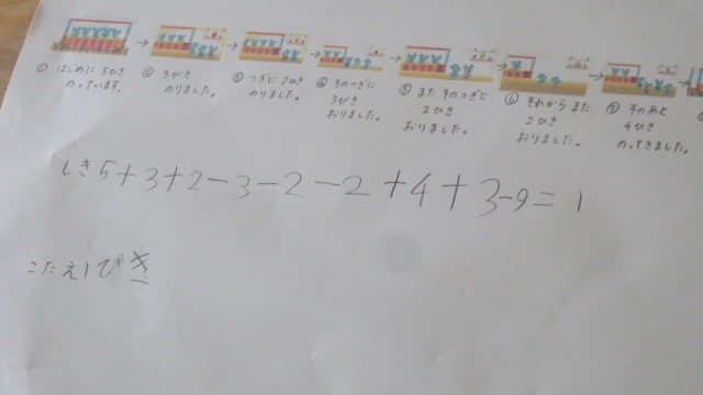 3つの数を足したり引いたりする学習のジャンプ課題で、バスに乗ったり降りたりする場面の計算に挑戦しました。