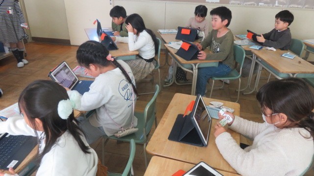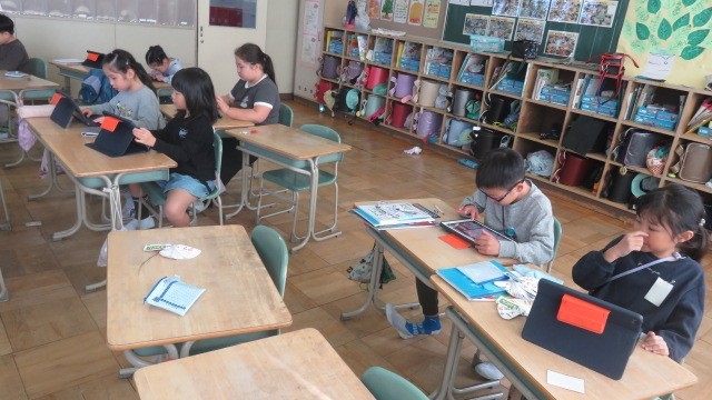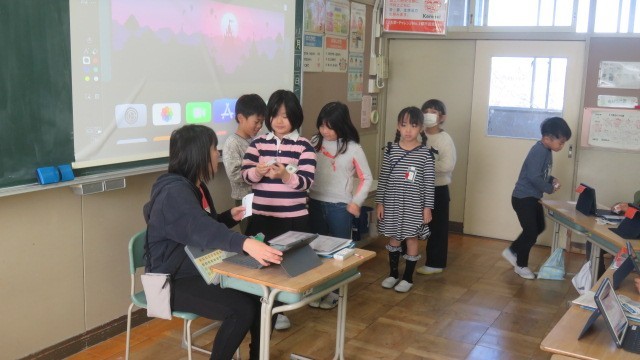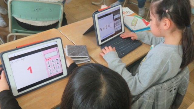 算数は、九九暗唱練習を頑張っています。各自がタブレットで九九の力試しをし、順番がきたら先生にチェックをしてもらいます。