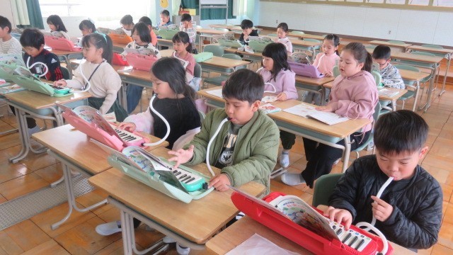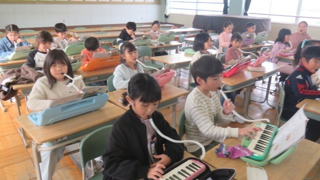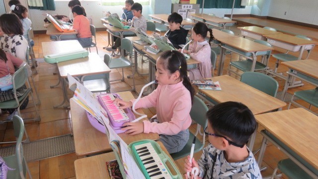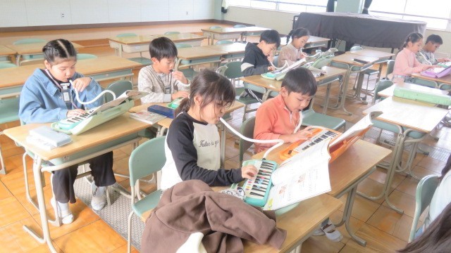 音楽の時間は、指使いに気をつけながら、鍵盤ハーモニカの練習をしました。指使いが正しいかどうかペアで見合ったり、伴奏に合わせて全員で演奏したりしました。