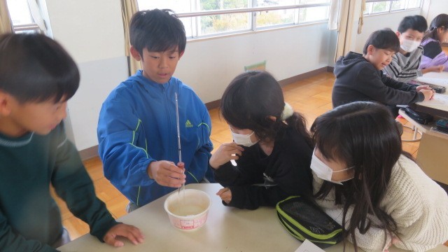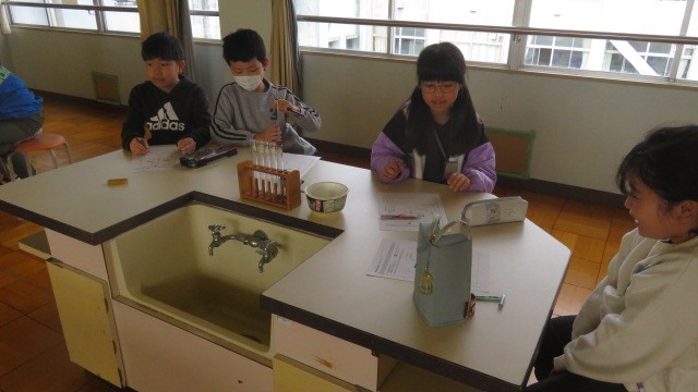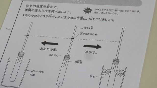 理科は、空気を温めたり冷やしたりしたときの体積の変化を調べる実験をしました。試験管の中の空気を温めたり冷やしたりしたとき、カラス管の中の水はどう動くかを観察しました。