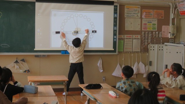 算数は、円の学習で、図の中のかごは、円の真ん中にあるかどうかをどう調べる方法を考えました。