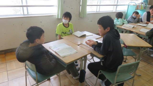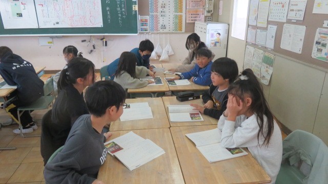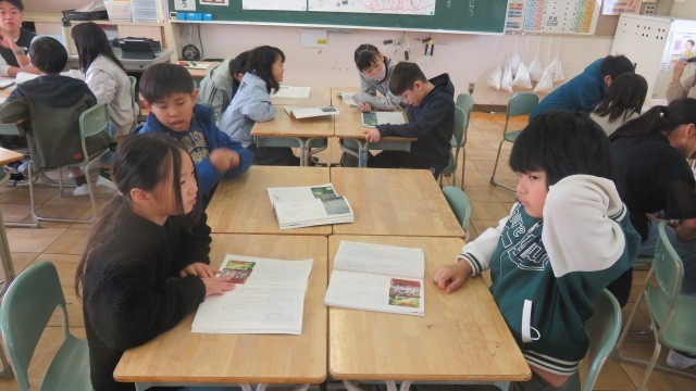 国語は、新見南吉の「ごんぎつね」を学習しています。場面の様子や兵十・ごんの気持ちを、グループで考えながら読み進めています。