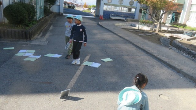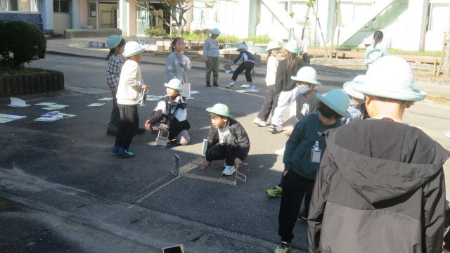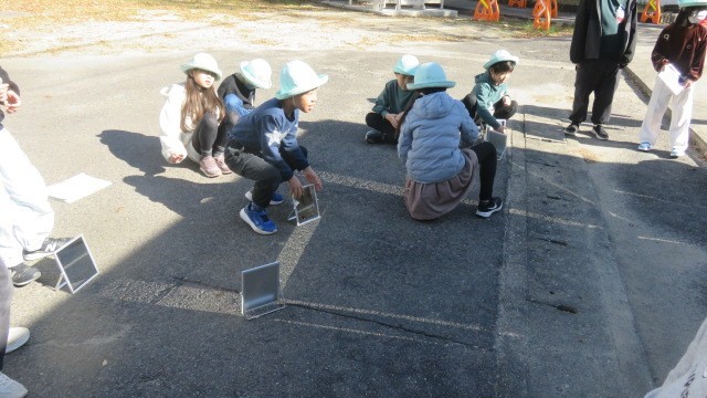 理科は、鏡で跳ね返した日光の光の進み方について、光を地面にはわせたり、はね返した日光をつないだりして調べました。