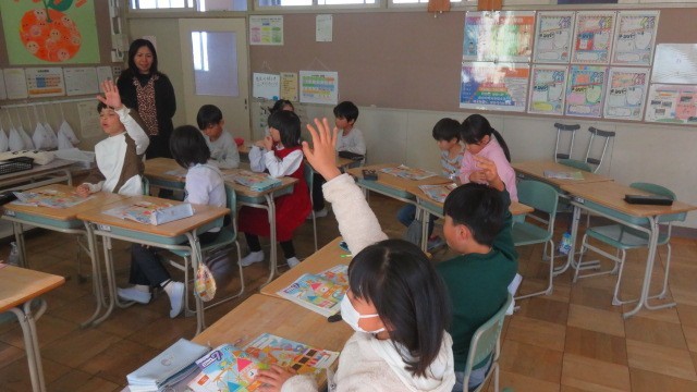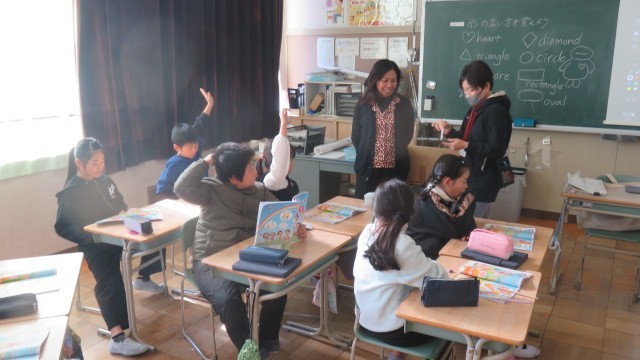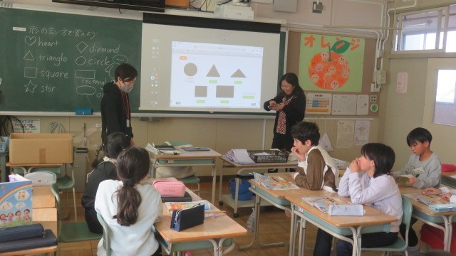 外国語活動は、丸・三角・四角などの形の言い方を練習しました。シェイプクイズをしながら、楽しく反復練習をしました。
