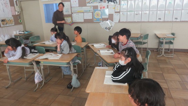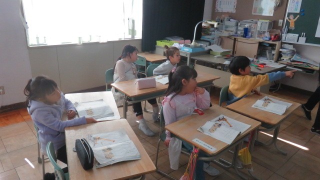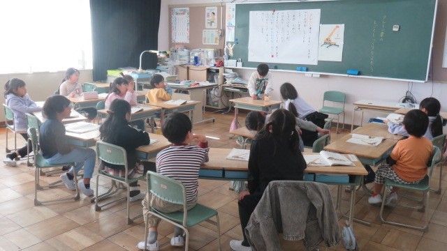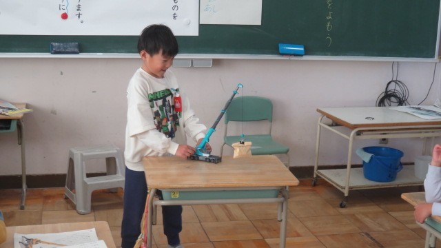 国語は、説明文に書かれているクレーン車の動きを、模型を使って再現し、車のつくりと車の仕事との関係を確かめました。みんな真剣に友達が模型を動かすのを見ています。
