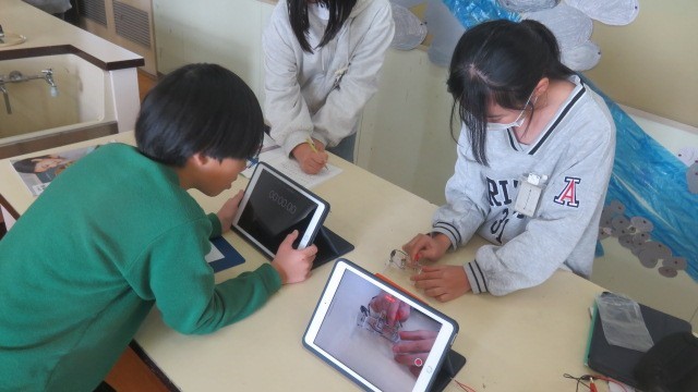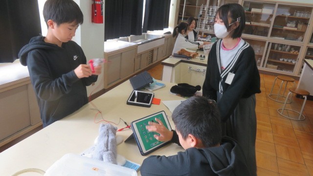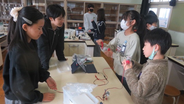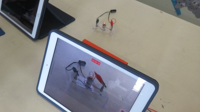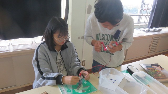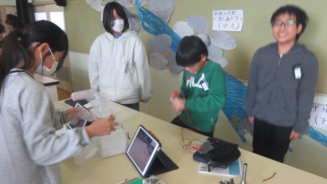 手回し発電機を同じ回数回して蓄電し、LEDと豆電球に電気を流した時、LEDと豆電球とでは、どちらが長く明かりがともるかを実験しました。