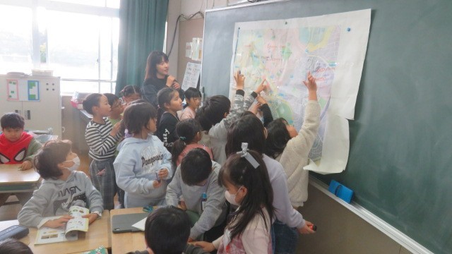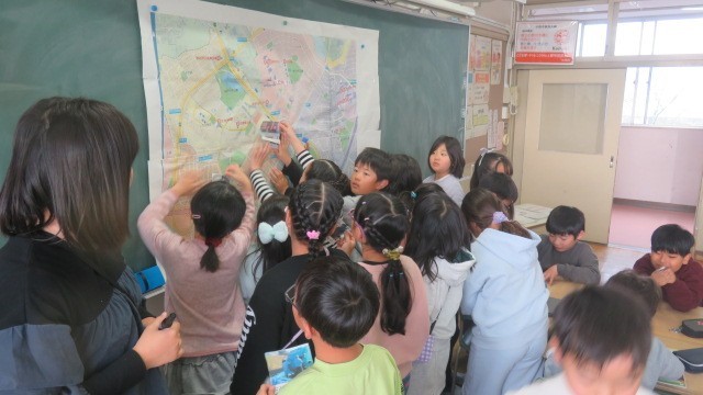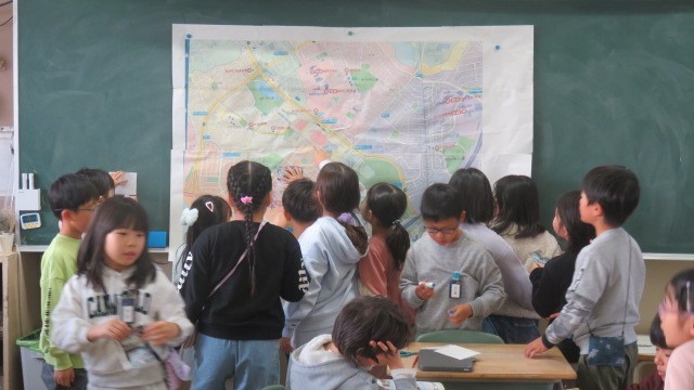 生活科で、校区にある施設をみつけに行ったり、あおぞら幼稚園・古雅保育園・桃花台交番・篠岡児童館へ出かけ、そこで働いてる人たちにインタビューをしてきました。今日は、校区の地図に、見つけた人たちの写真を貼りました。