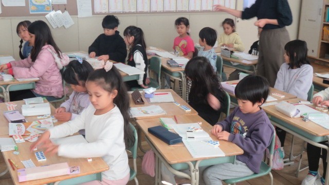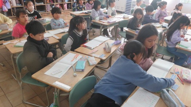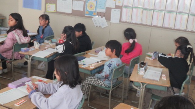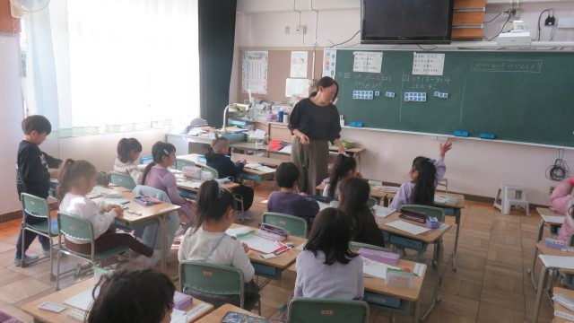 数図ブロックを操作しながら、繰り下がりのあるひき算の計算の仕方を学習しました。具体物の操作から数の操作に徐々に移していきます。