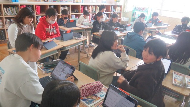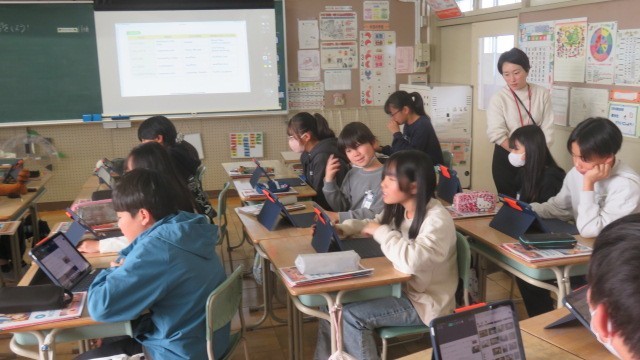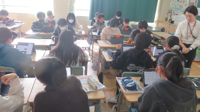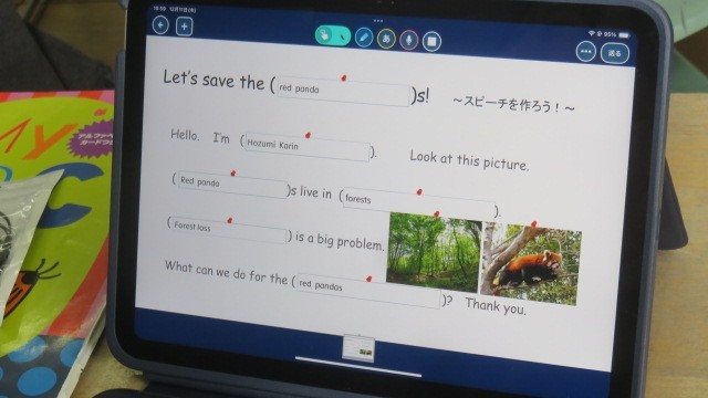 外国語科は、生き物のために自分たちができることをスピーチする学習をしています。興味がある動物とその動物が抱える問題を教科書の一覧から選び、スピーチ原稿を作って練習しました。