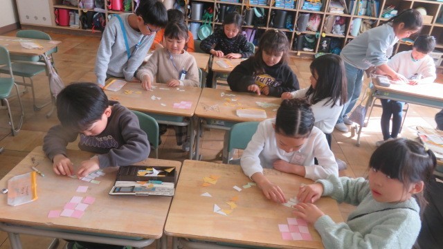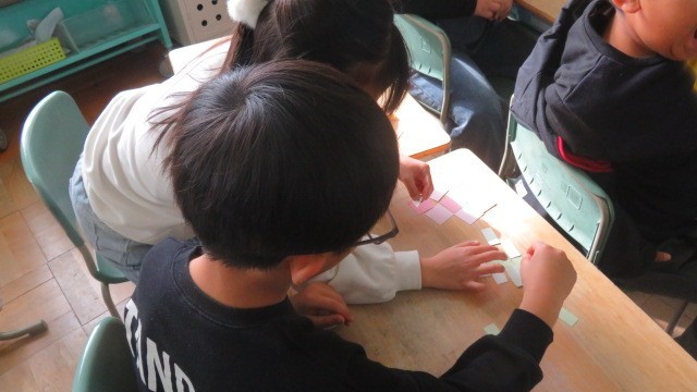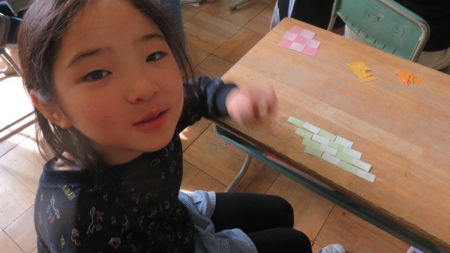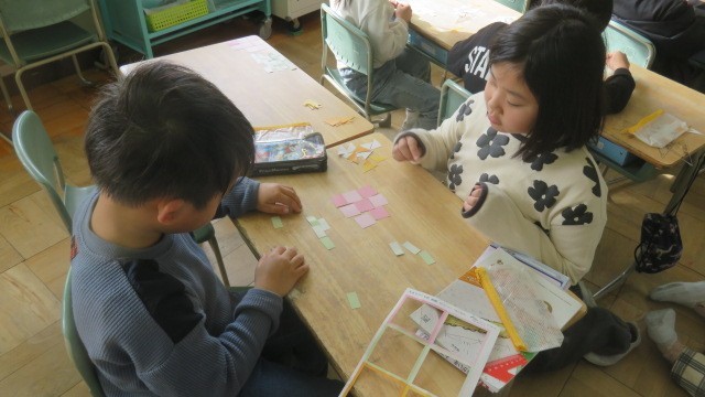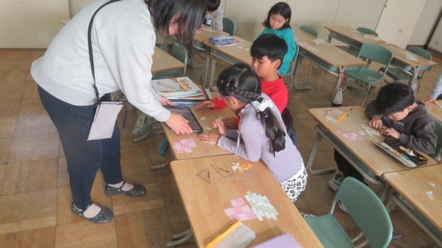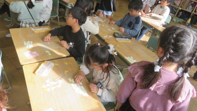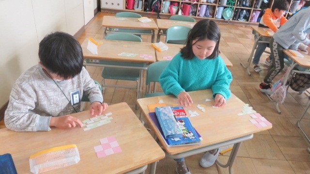 算数は、長方形・正方形・直角三角形の学習で、同じ形を並べて、お手本と同じ模様を作ることに挑戦しました。半分ずつずれていたりすると、意外に並べることが難しかったようです。