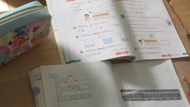 算数は、1Lますの7分目まで入っている水のかさの表し方を考えました。