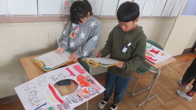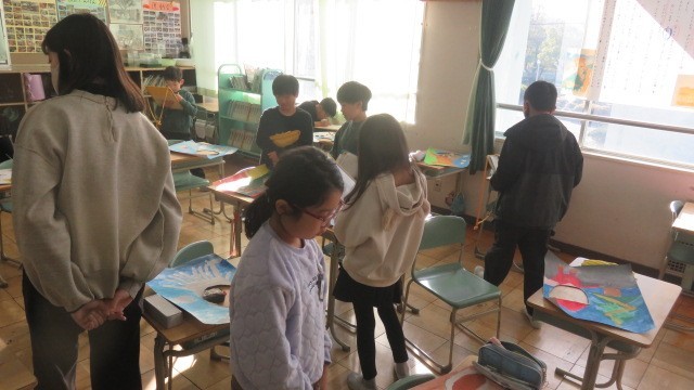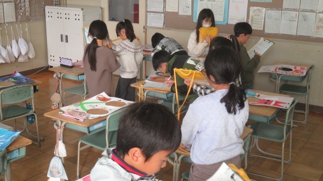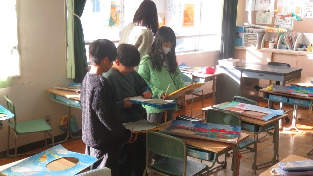 図工は、友達の作品を見て回り、まねしたいところや工夫しているなと思うところをみつけました。
