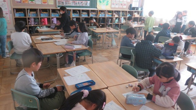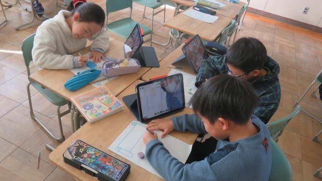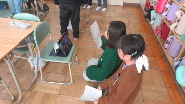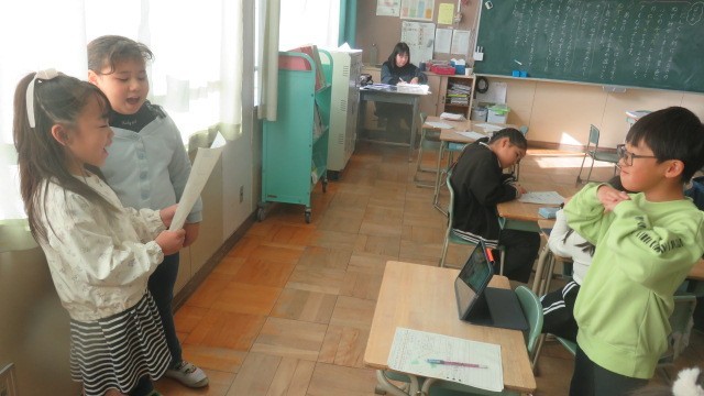 校区探検で見つけ、インタビューしてきた人たちの仕事の様子をペアで発表します。今日は、発表原稿ができたペアから、発表練習の様子を動画にとりました。