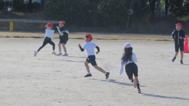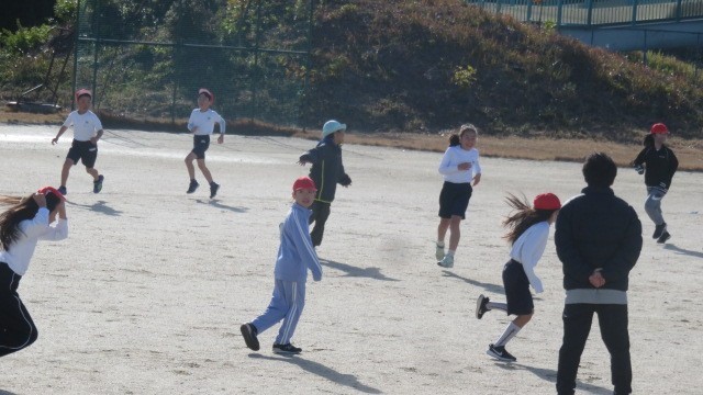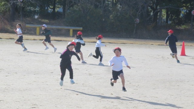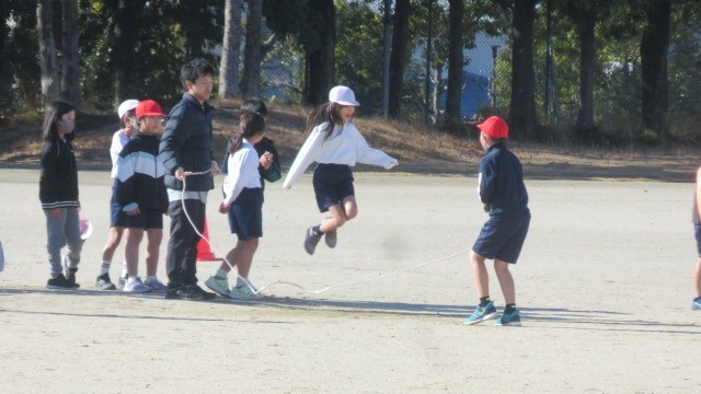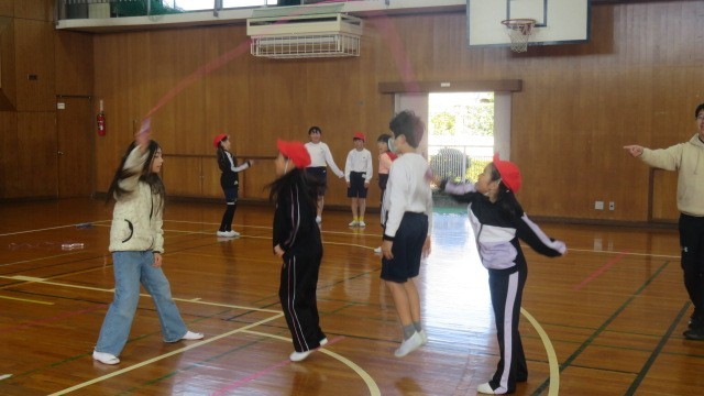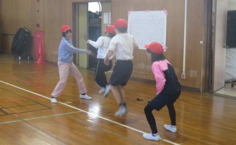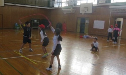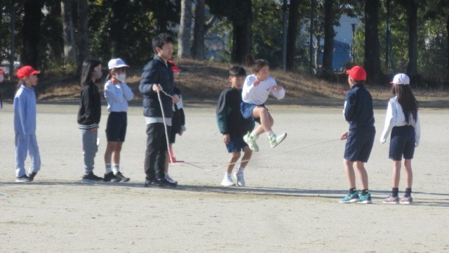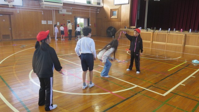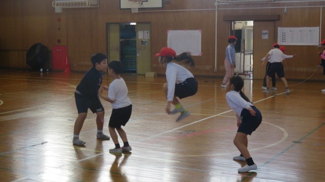 鬼ごっこなどでウォーミングアップをした後は、縄跳びの練習をしました。一人跳びだけでなく、複数人で一緒に跳ぶ練習もしました。