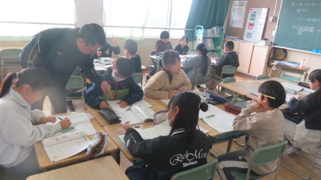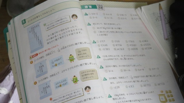 算数は、小数のわり算の筆算の練習問題に取り組みました。