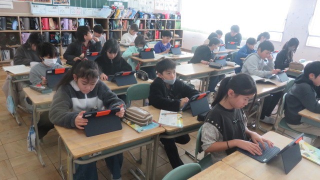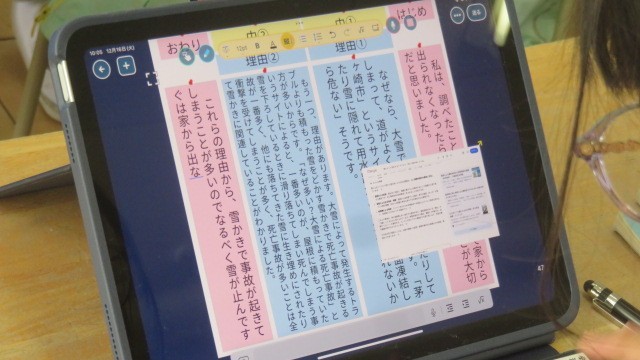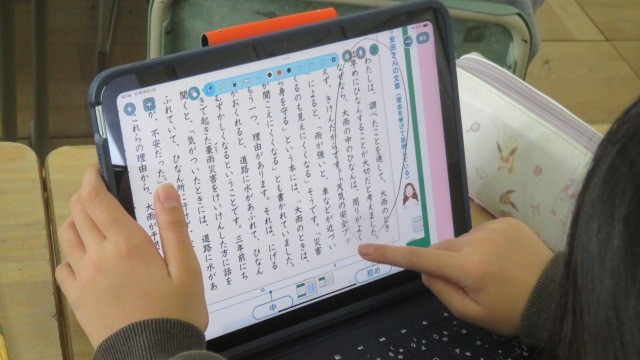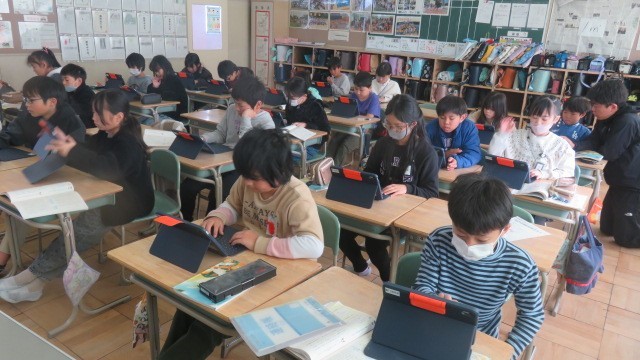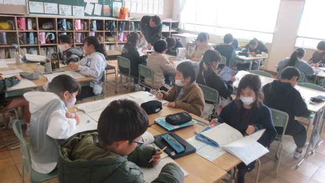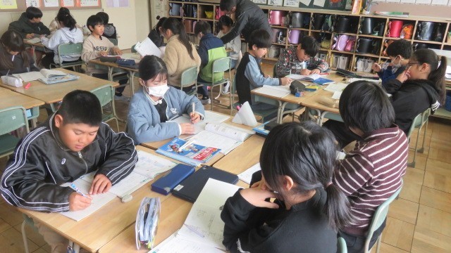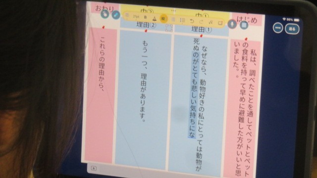 国語は、自然災害に対する備えについての自分の考えを文章にする学習をしています。今日は、教科書の文例を参考に、「はじめ・中・終わり」に書く内容を考えました。