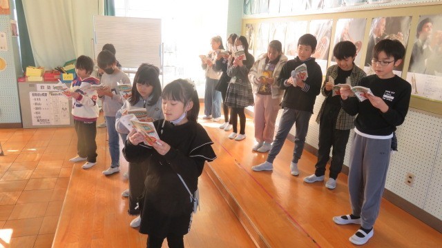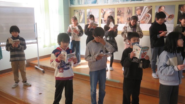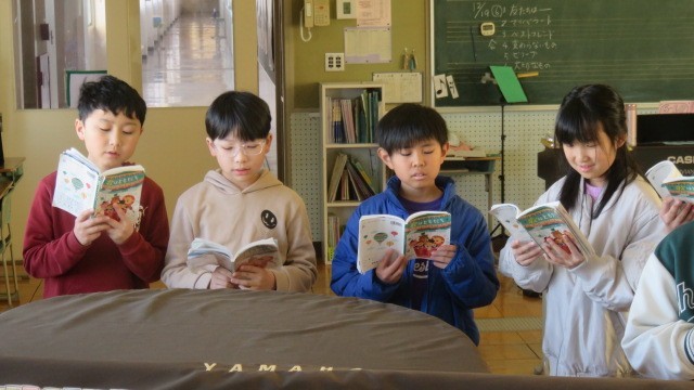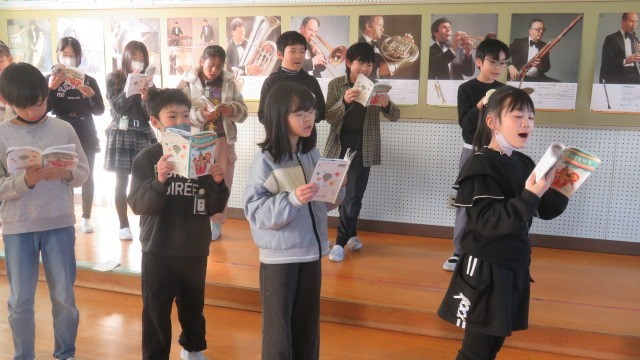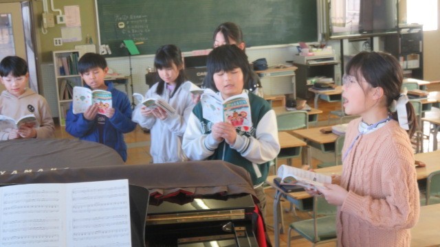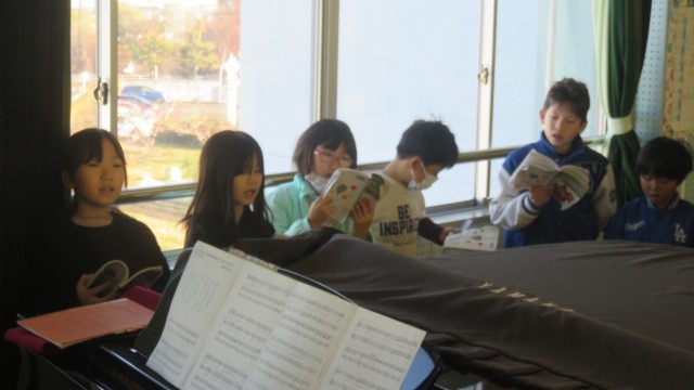 音楽は、「大切なもの」の2部合唱の練習をしました。パートごとに、ピアノで音取りをしてもらいながら、正しい音程を覚えました。とても素敵な歌です。