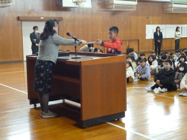 2学期も最後の日を迎えました。終業式では、校長先生や生徒指導担当の先生からのお話を聞きました。式の後には、作品募集などで成果を上げた人の表彰達も行われました。
