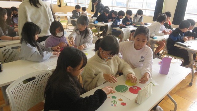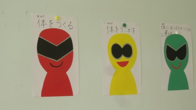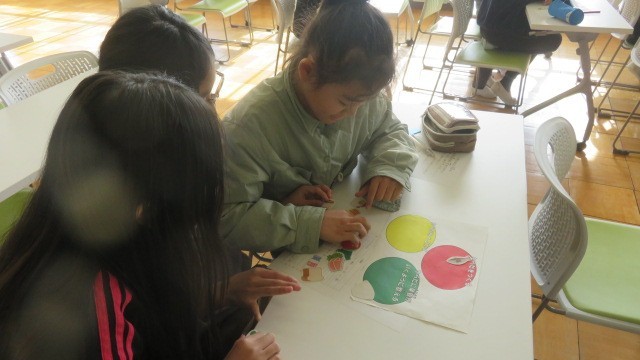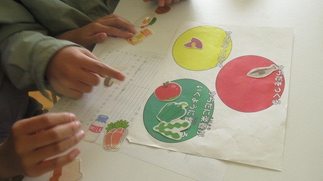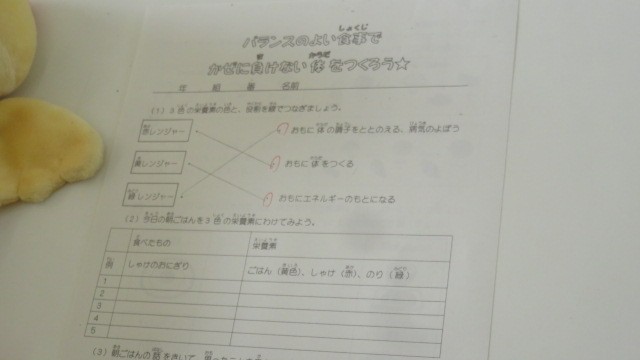 発育測定の時間に、「バランスの良い食事でかぜに負けない体を作ろう」というテーマで、保健の先生から保健指導をしていただきました。3つの栄養素の色とその役割を考え、ワークシートに食物の仲間分けをしました。好き嫌いなく、バランスよく食べることは、成長期の体を作るうえでとても大事なことですね。