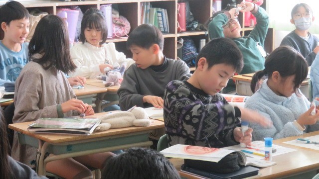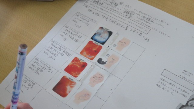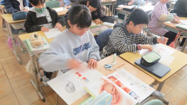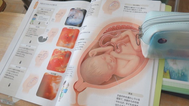 理科は、人の母体内での子どもの成長の様子を、それぞれの成長段階の写真を並べながら学習しました。