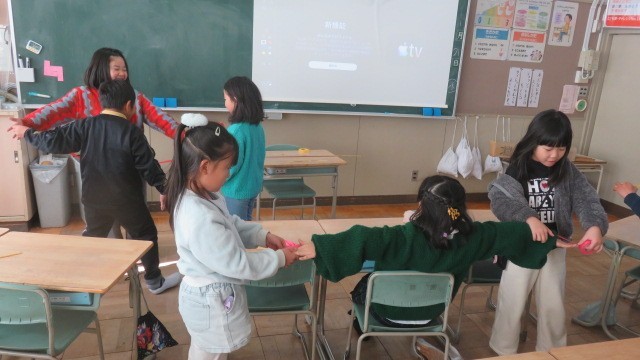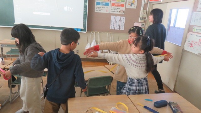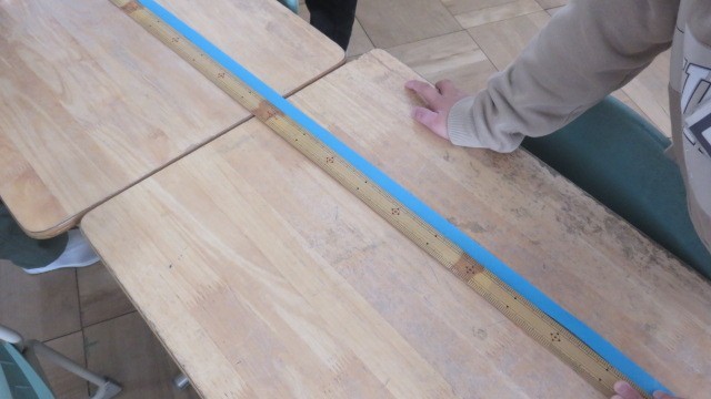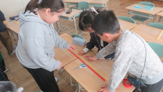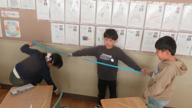算数の長さの学習で、はじめて100cmをこえる長さを学習します。両手を広げた長さを紙テープで計り取り、1mものさしと竹尺で長さを計る活動をしました。