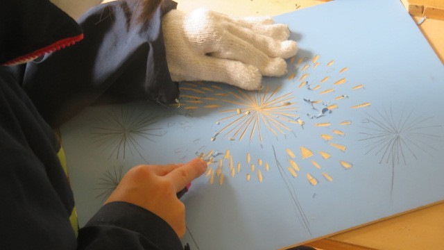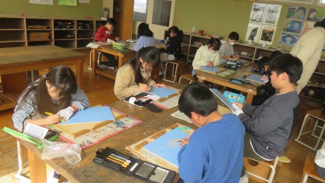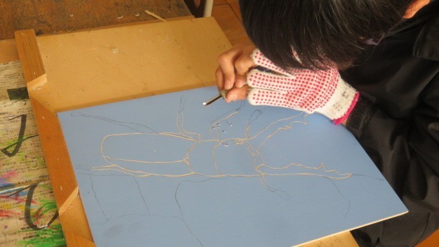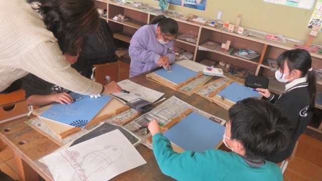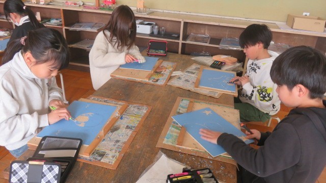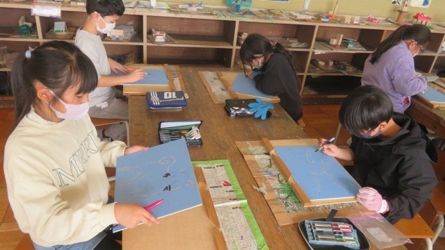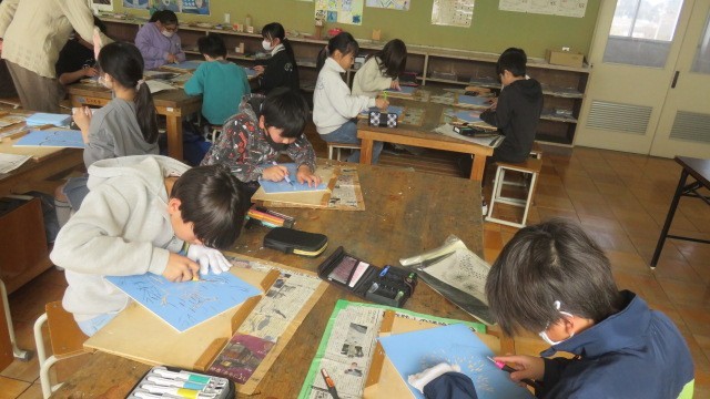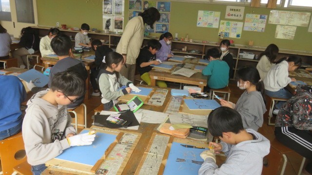 図工は、木版画の板彫りに進みました。インクを塗って刷ったときの「白と黒のバランス」を考えながら、彫刻刀で彫り進めました。