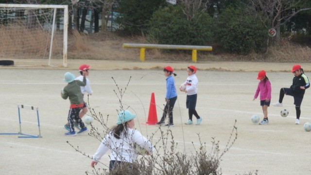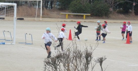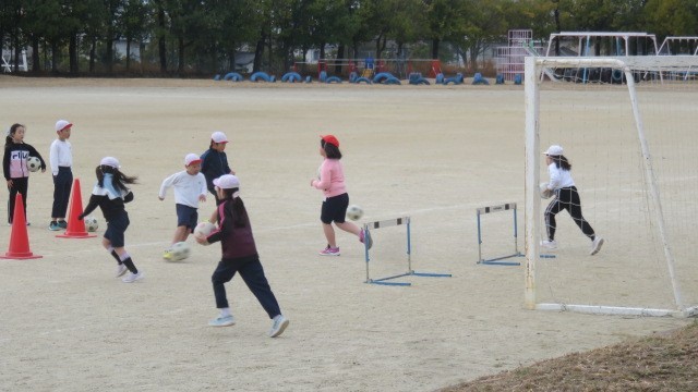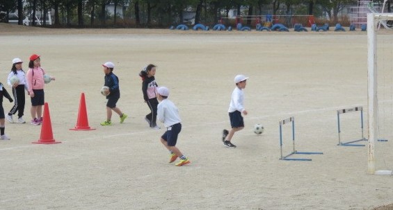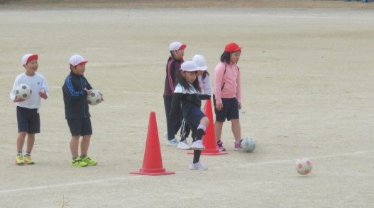 体育は、ハードルをゴールに見立て、ゴールに入るようにボールをける練習をしました。なかなか思ったところに転がってく入れません。