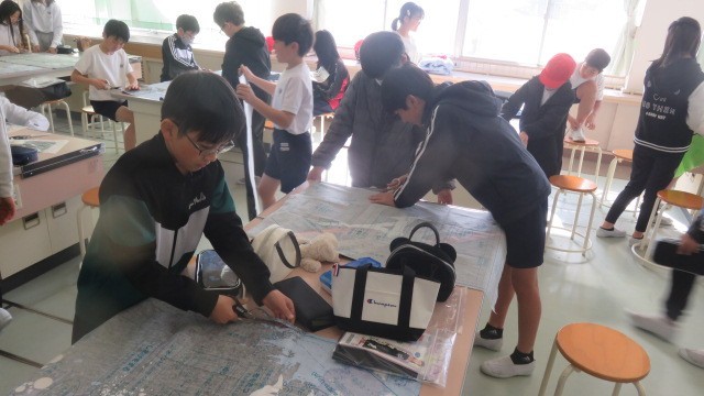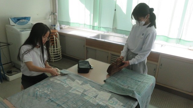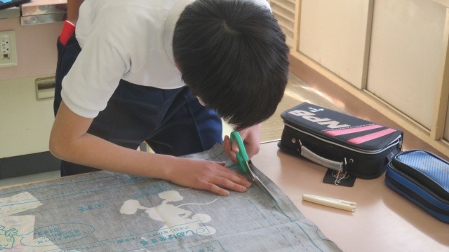 家庭科は、練習布を使ったミシン縫いの練習が終わり、いよいよエプロンづくりに入りました。エプロンの丈の長さを決め、余分な部分を切り落としました。