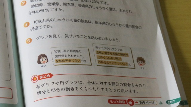 算数は、円グラフや帯グラフなど、複数の割合を表すグラフを読み取ることで答えを求める学習をしました。