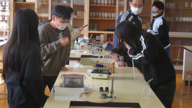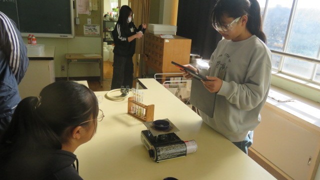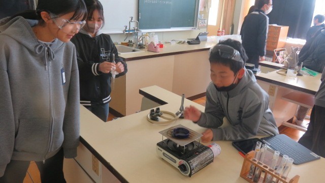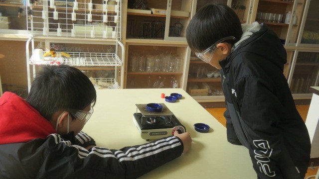 理科は、水溶液に溶けた金属はどうなったのかを、水溶液を蒸発させる実験をして調べました。