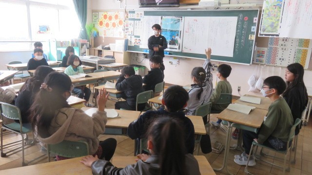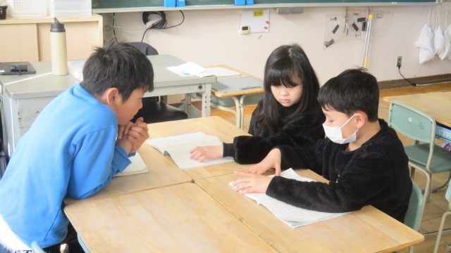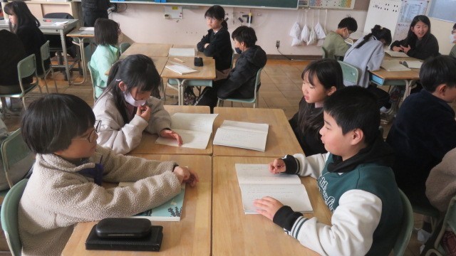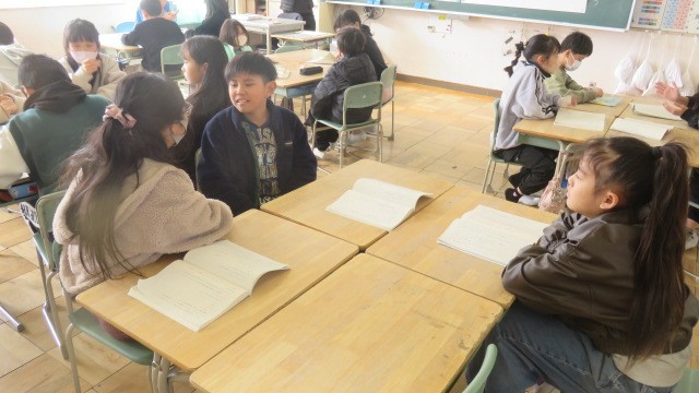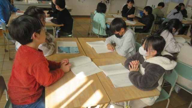 国語は、アメリカのスワンレイクを訪れた小学生の主人公が、多様な文化や人々と出会い、出会った少年と友情を育む物語を学習しています。場面の様子や登場人物の気持ちを想像しながら、物語の世界を読み味わいました。